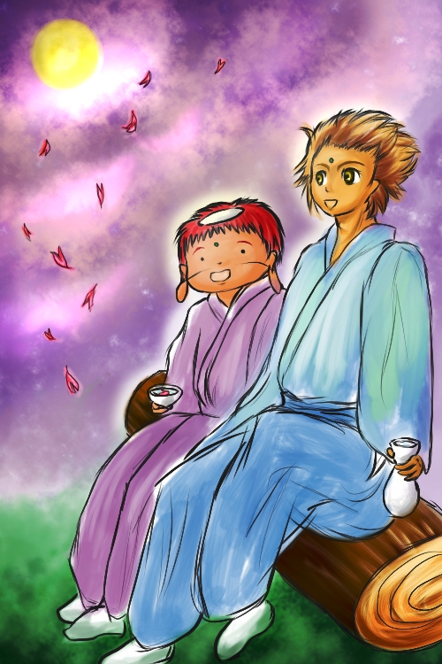 酒飲み2人組、不知火と福が、夜桜の下でお酌をしています。